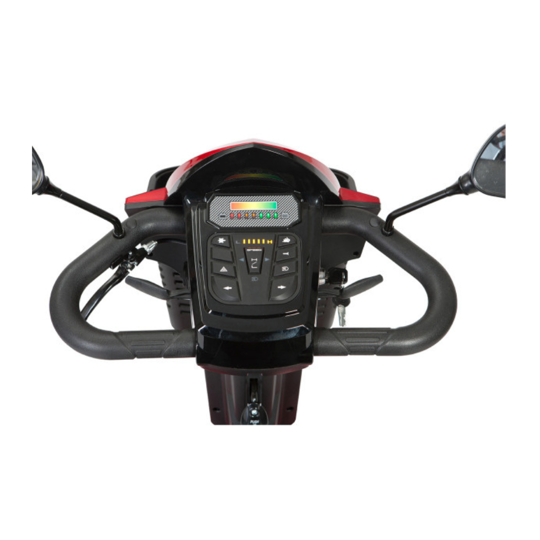 The Panther scooter combines modern design with a range of top-notch features to deliver a smooth and comfortable driving experience. Notable features include one-touch infinite tiller adjustment and delta controls for effortless steering and throttle control, a plush Captain’s Seat with height adjustability, a reclining backrest, and an adjustable headrest. Equipped with 14” alloy wheels and front and rear suspension, the Panther ensures a smooth ride on any terrain. Additional highlights include extra-bright LED headlights and turn signals, dual rearview mirrors, and a spacious front basket with a convenient carry handle. For an unparalleled driving experience, choose the Panther.