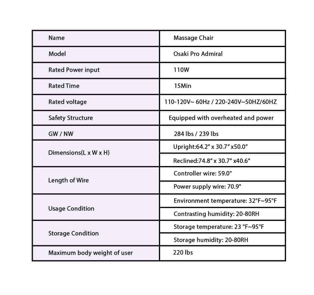 The Osaki Admiral massage chair with LED light control features an L-Track system with zero gravity, 16 auto massage programs, and a Full Body Airbag massage. With the Osaki OS-Pro Admiral massage chair, you will have complete control of your relaxation experience. Massages are adjustable with 6 Massage Styles, 2 inches Space Saving Technology, Heat on Lumbar, Enhanced Sounds, Multi Language Support And many other features.