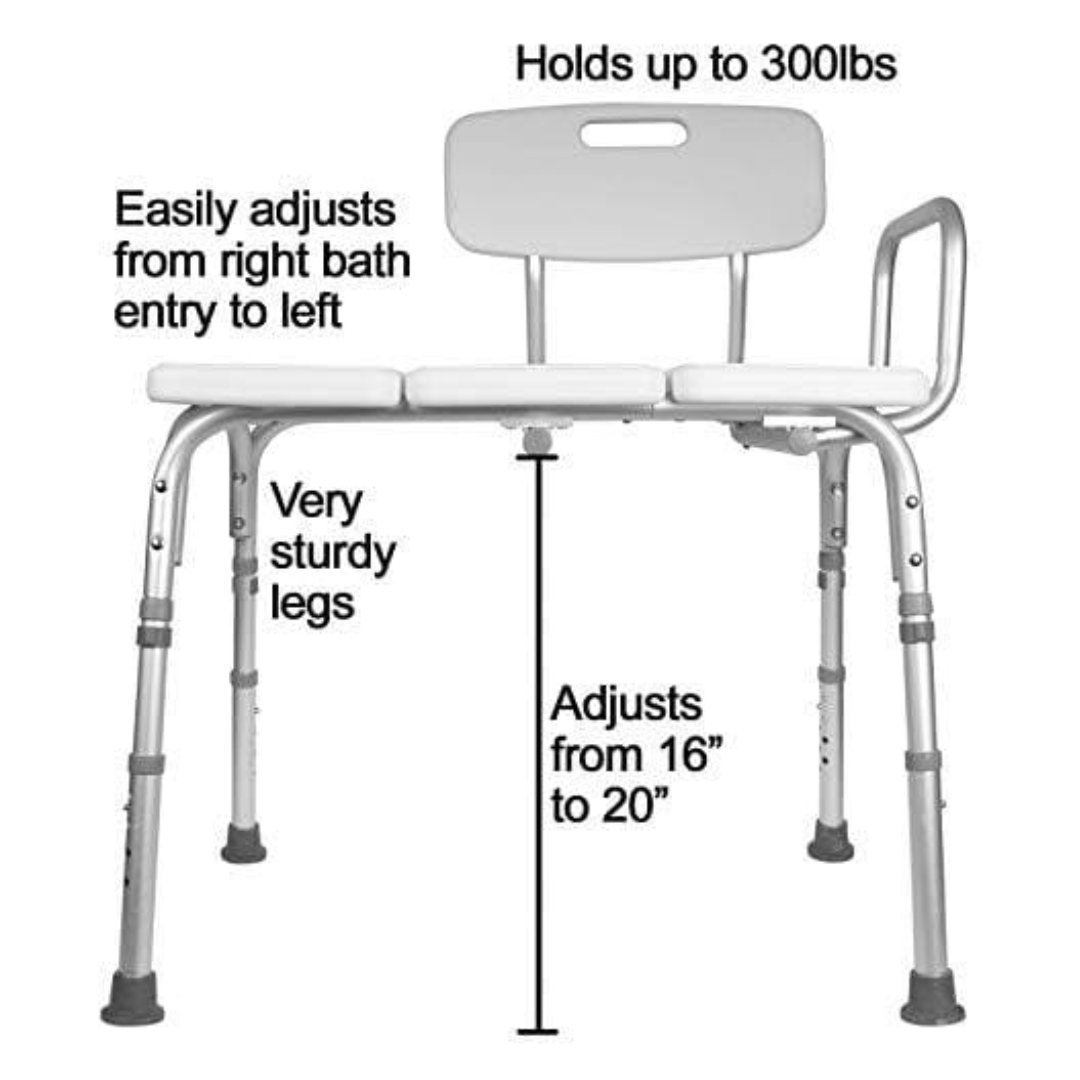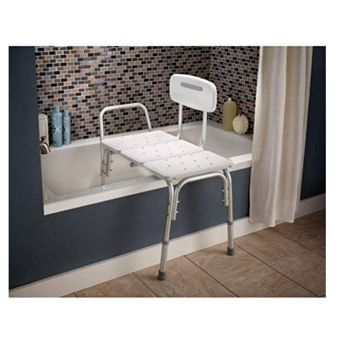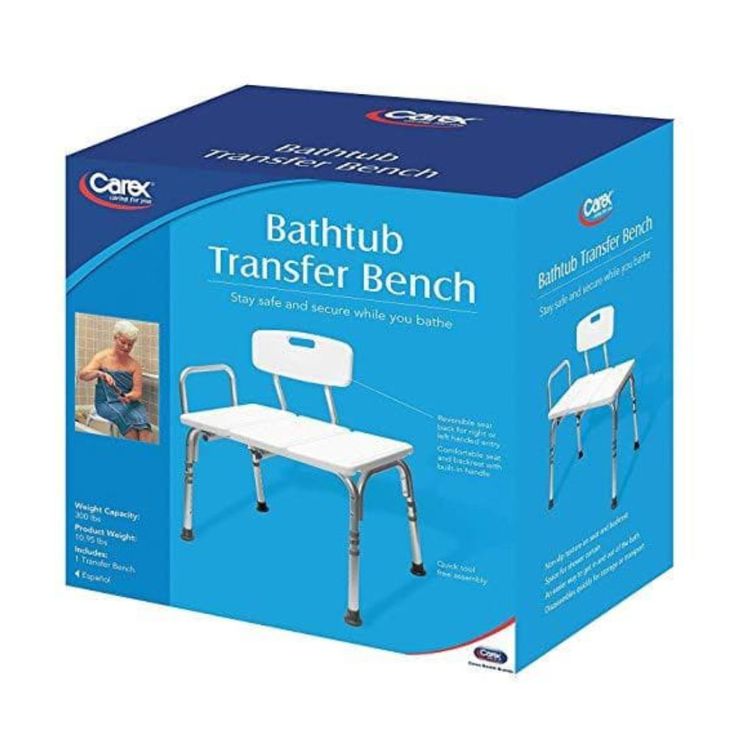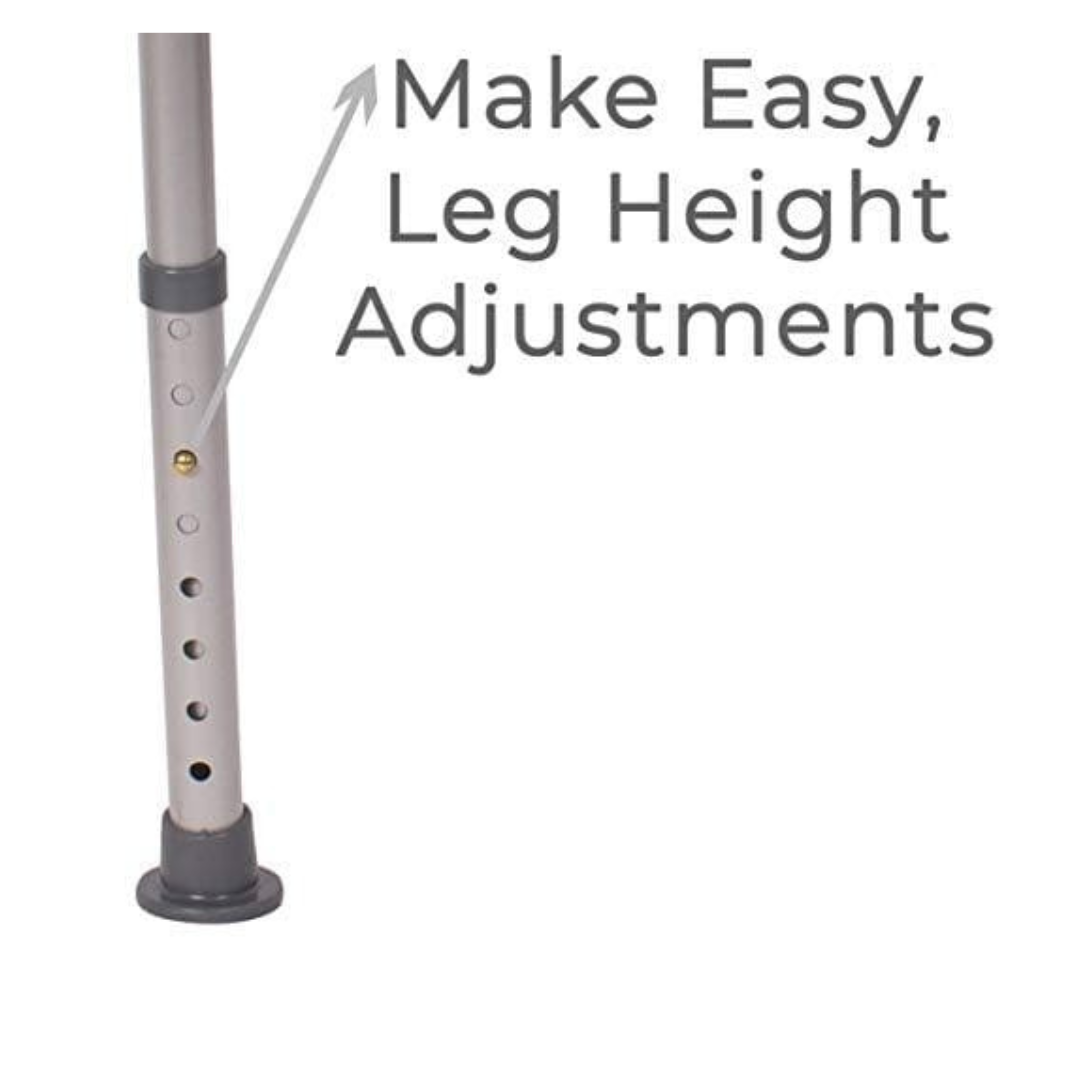 The tub transfer bench by Carex is a bathtub transfer bench with aluminum legs. The bench features a space for shower curtain placement, an adjustable seat height, and a textured, non-slip surface on both the shower seat and back of the bench. Shower chair comes standard with over-sized slip-resistant leg tips for increased stability..
