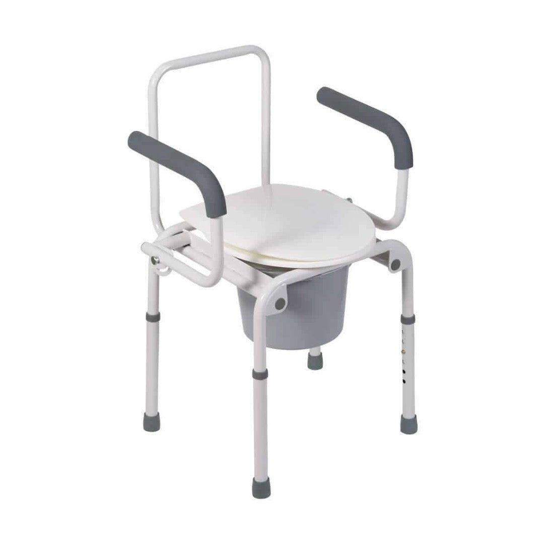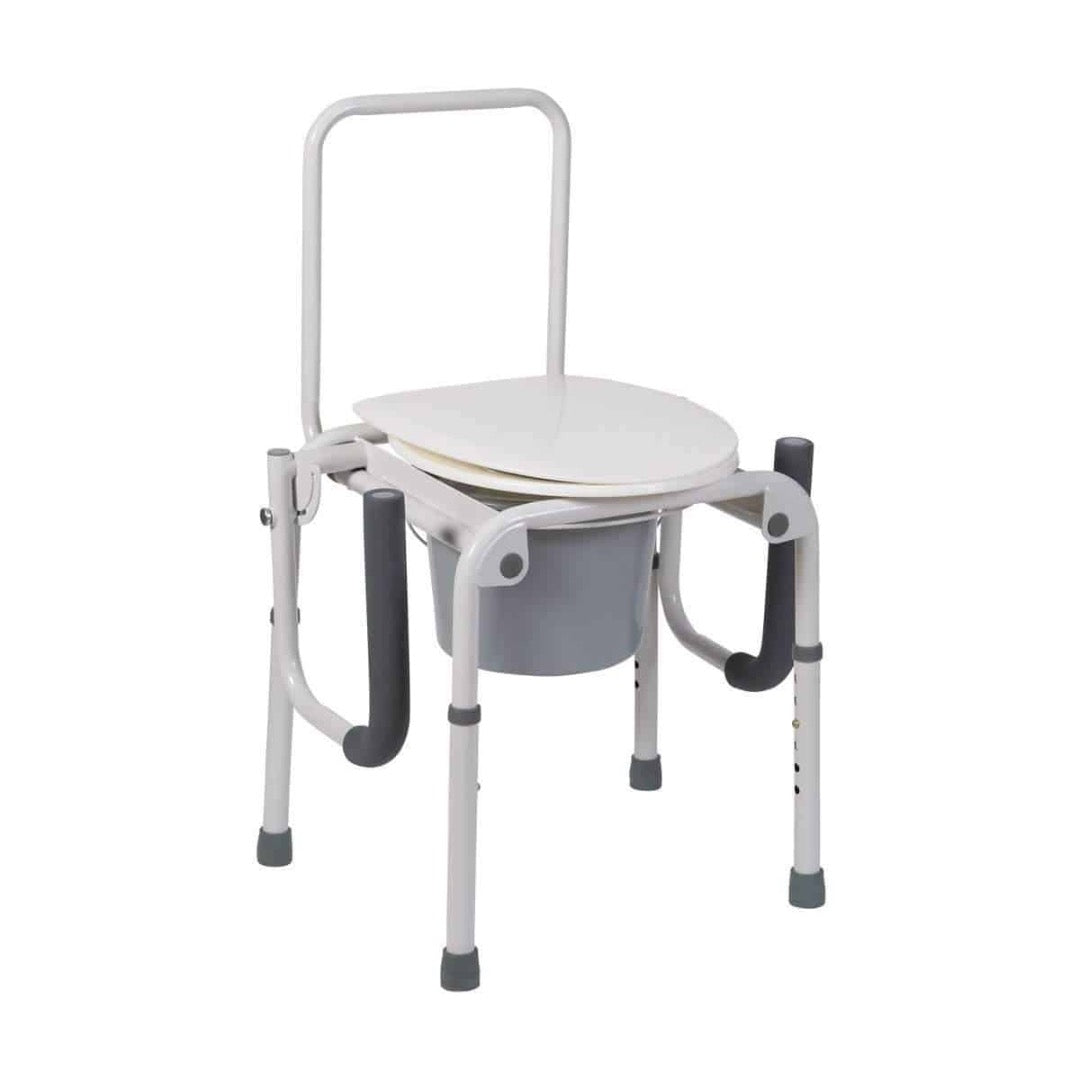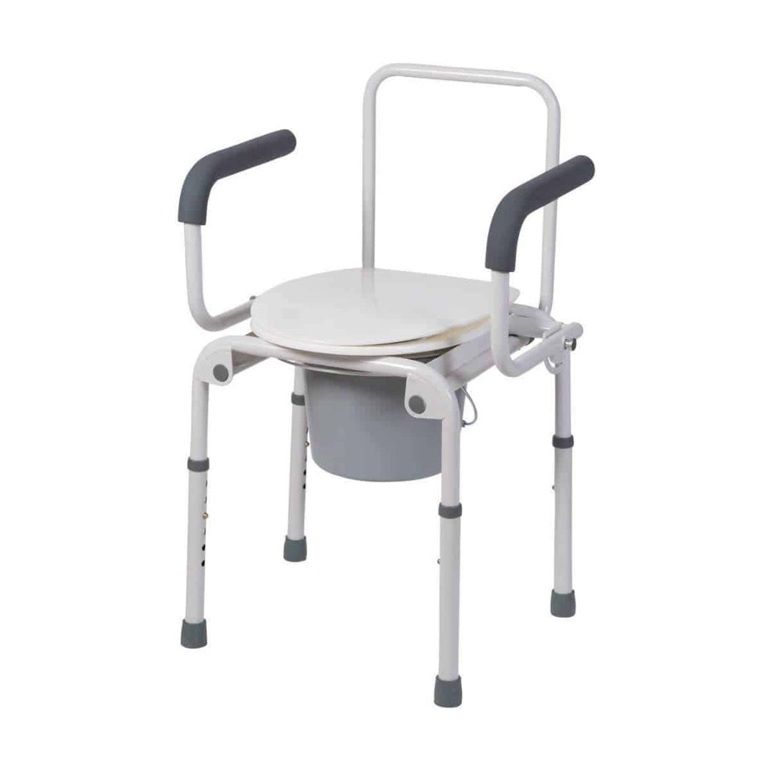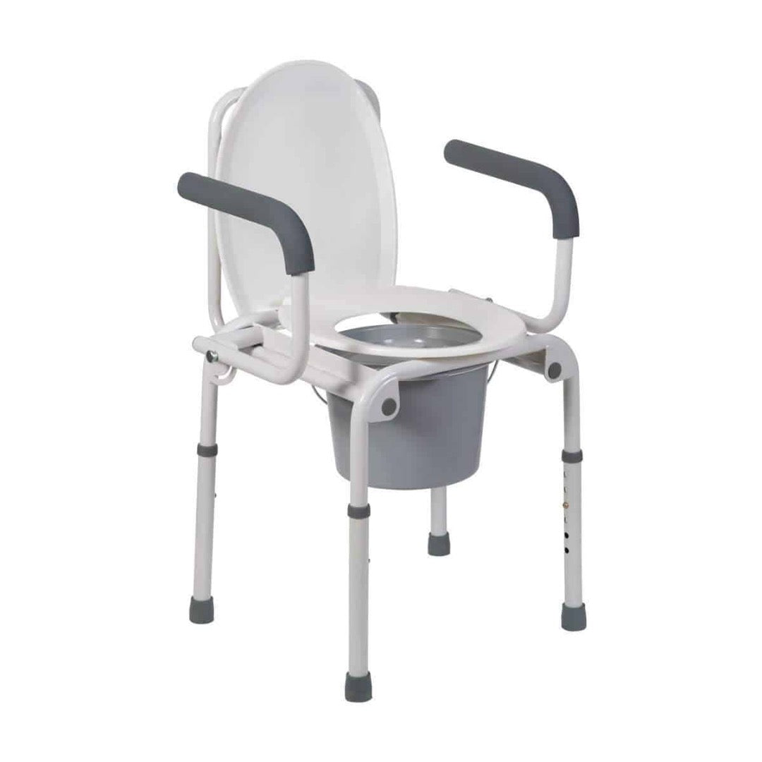 Never worry about making it to the bathroom again with this convenient and portable commode! This commode will make it easier for those who have difficulty making the long trip to the bathroom. You can use it next to the bed or wherever convenient. The arms are handy for steadying yourself and getting up and down but can also be dropped down so it’s easier to transfer across from the bed or wheelchair. The seat height conveniently adjusts from 19 to 23 inches in 1-inch increments. The commode comes with a plastic seat and an 8-quart capacity pail with lid and splash guard.