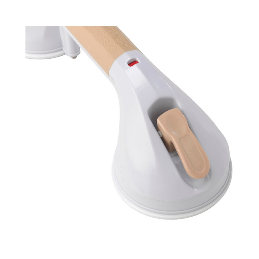 The Drive Medical 12" Suction Cup Grab Bar is designed to provide confidence and support while navigating in the bathroom or around the house. It offers a sturdy handhold that's versatile and reliable. With its red/green installation indicator, you can easily confirm whether the grab bar is securely in place or needs adjustment for proper use. Installing it at any angle is hassle-free, requiring no tools or property damage, thanks to the strong suction cups. Its sleek design is sure to complement any decor style.
