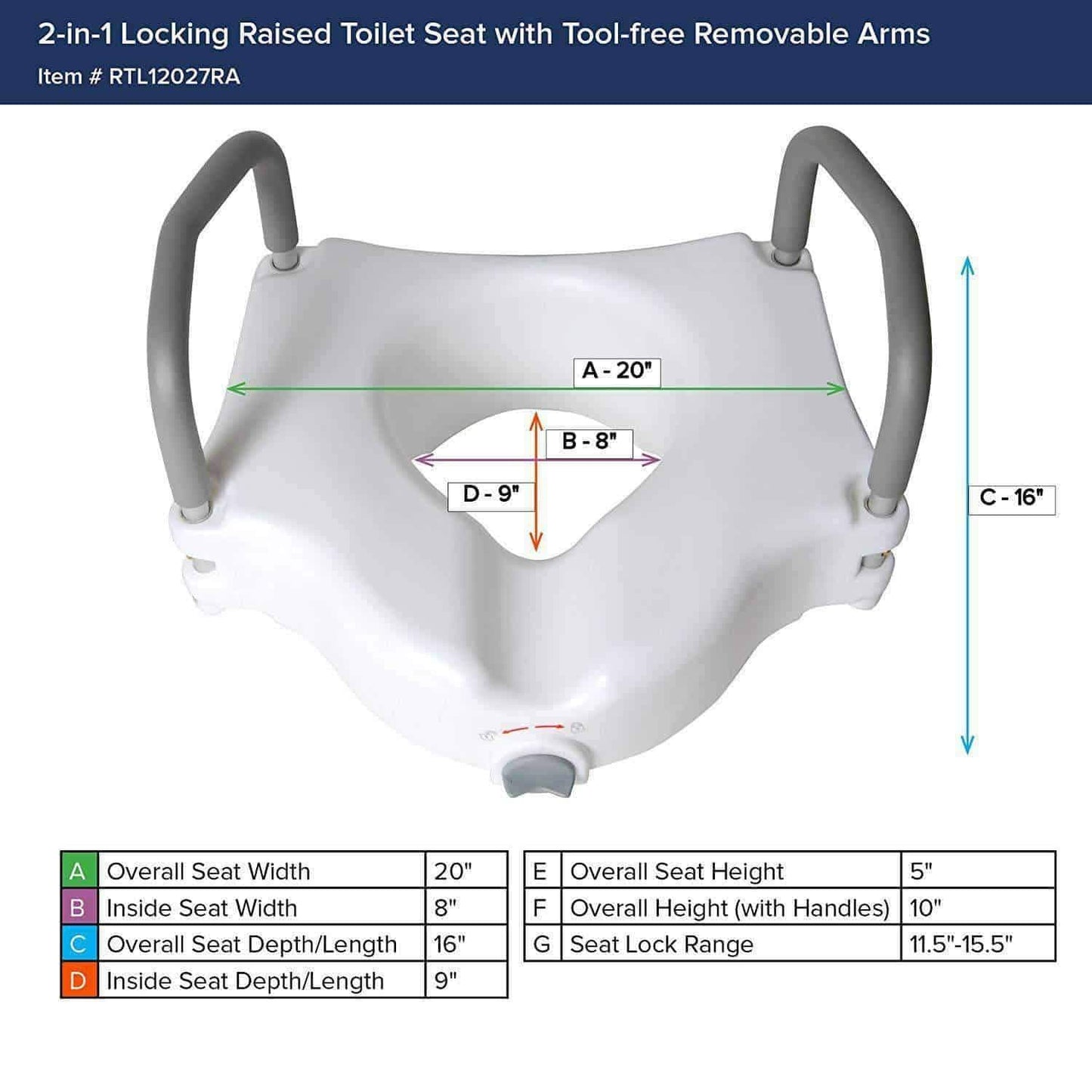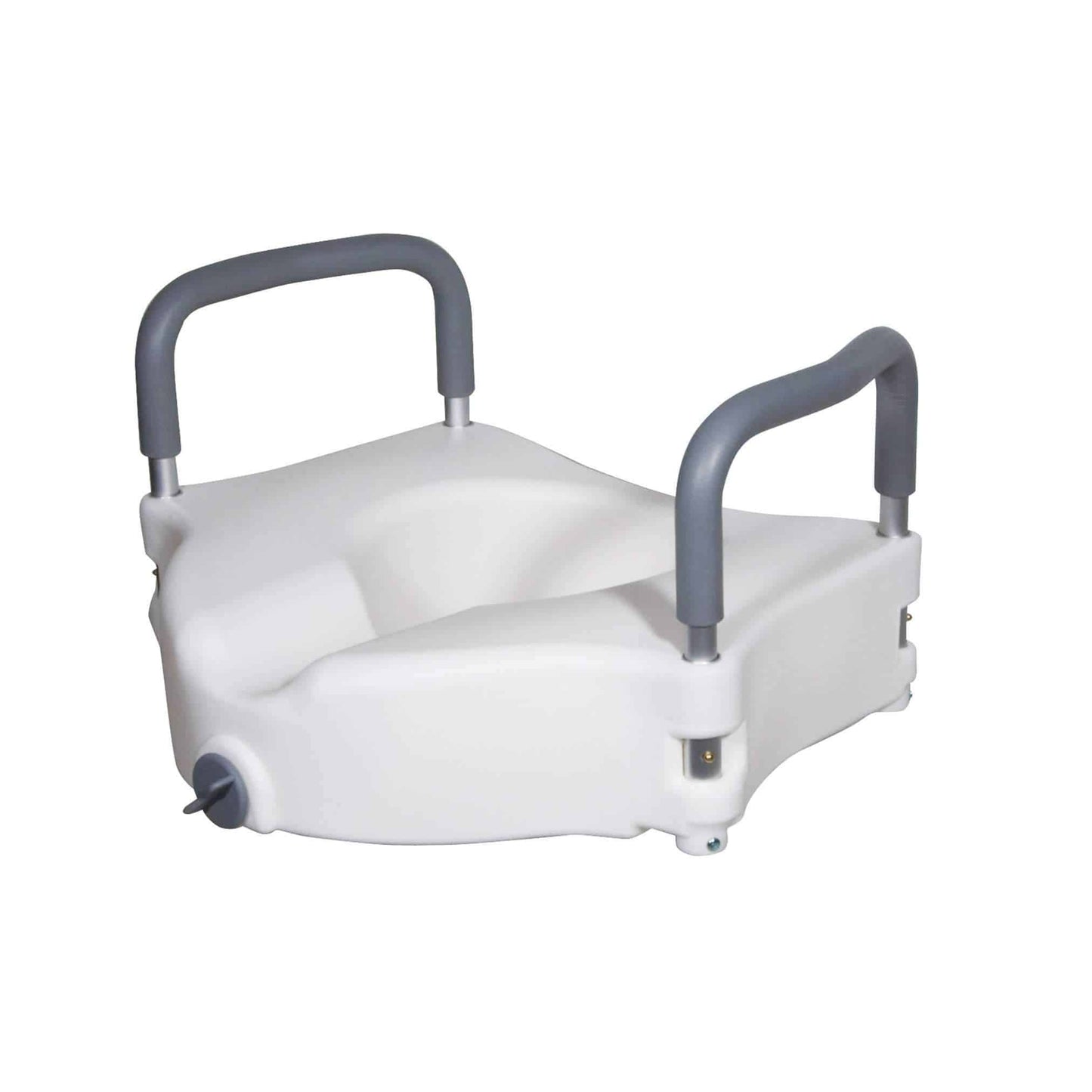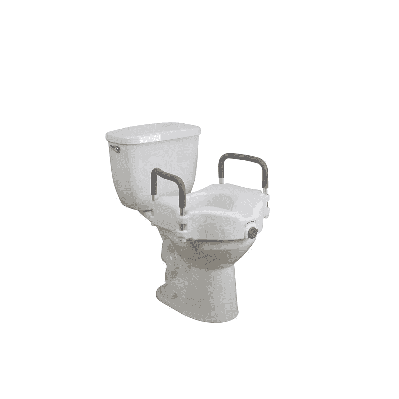 The Drive Medical Elevated Toilet Seat is expertly designed as a bathroom safety solution for individuals who have difficulty sitting down or getting up from the toilet. The newly designed locking device is engineered to fit securely on almost any toilet seat and is simple to operate. Lightweight, portable, and easy to clean, the Elevated Toilet Seat is crafted from heavy-duty molded plastic that is durable enough to withstand regular daily use. The Elevated Toilet Seat features comfortable padded arms for extra support that, if desired, are easily removable without tools.