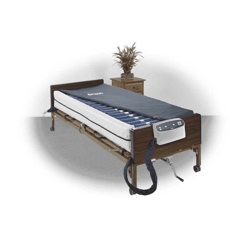 The product is designed to be used in the prevention, treatment and management of Pressure Ulcers. This mattress has a total of 20 air bladders and has specially designed air supply manifolds which quietly operate alternating pressure and air loss systems, while maintaining firm "Defined Perimeter". Cell-on-Cell design prevents "Bottoming Out" in the event of power failure. The LED and Audible alarm activates when mattress pressure falls below 10 mmHg. Spring lined tubing prevents kinks and helps maintain airflow. Quick fill adapter comes standard and CPR valves provide fast (20-Second) deflation.