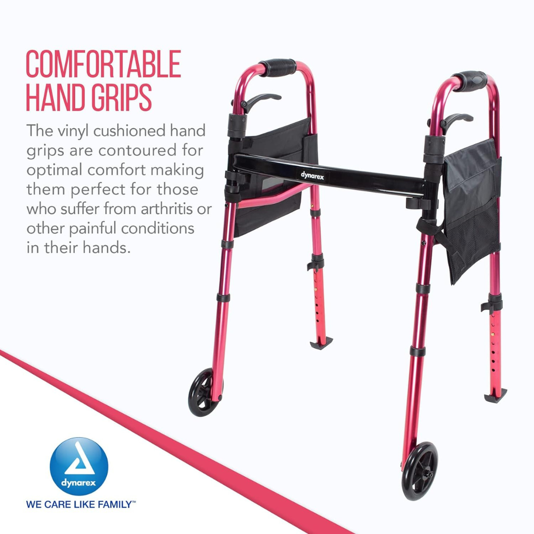 - SLEEK AND COMPACT: The Dynarex Travel Walker with Wheels folds to a streamlined profile without the use of any tools, making it easily portable, ideal for travel, or simply to store out of the way. Soft, compact side storage bags are included.