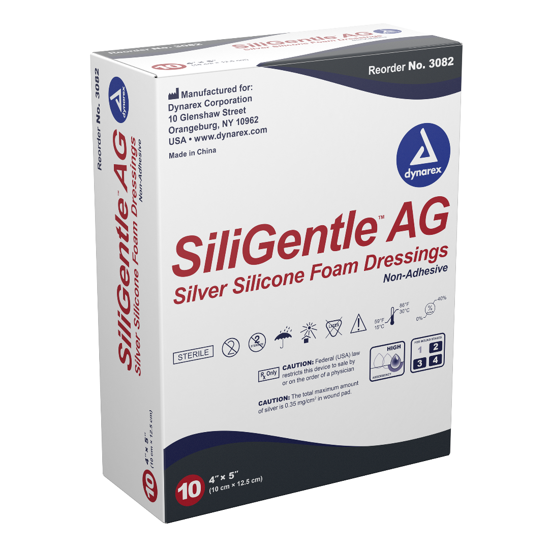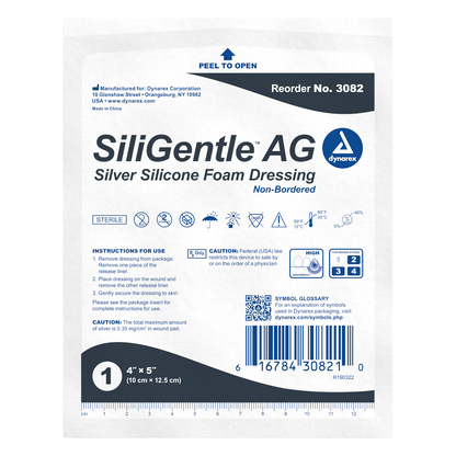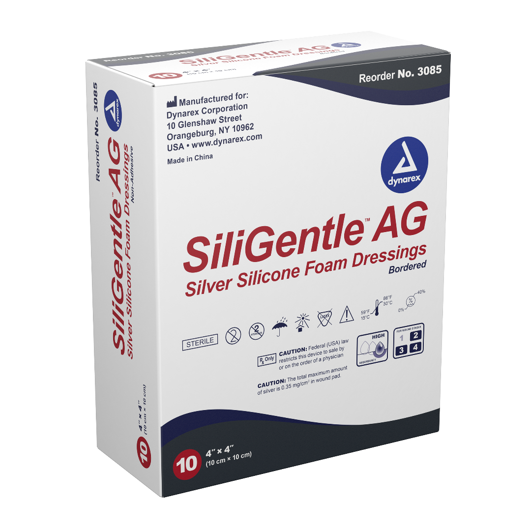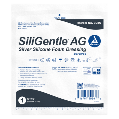 Dynarex’s SiliGentle AG Silver Silicone Bordered and Non-Bordered Foam Dressings excel in exudate management and antimicrobial protection. Soft and adaptable, they provide a moist wound environment to accelerate healing. The silver foam core not only absorbs exudate, but also releases silver ions into the wound bed for an antibacterial effect.