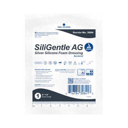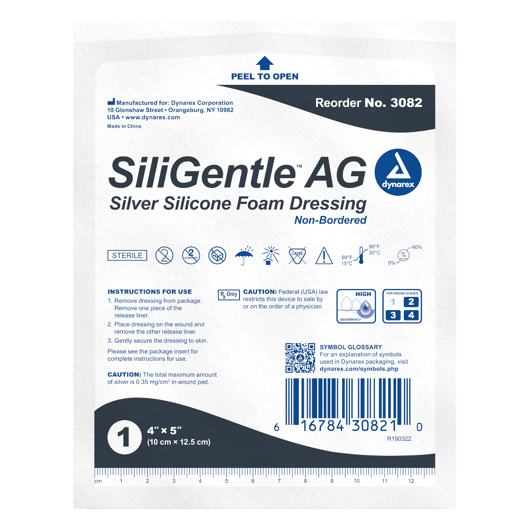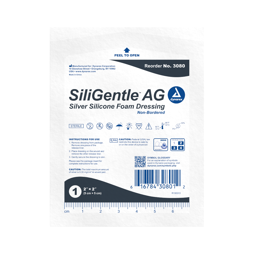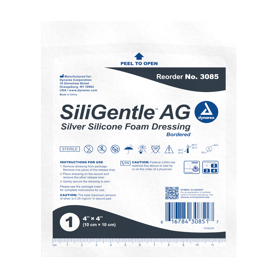 Dynarex’s SiliGentle AG Silver Silicone Bordered and Non-Bordered Foam Dressings excel in exudate management and antimicrobial protection. Soft and adaptable, they provide a moist wound environment to accelerate healing. The silver foam core not only absorbs exudate, but also releases silver ions into the wound bed for an antibacterial effect.