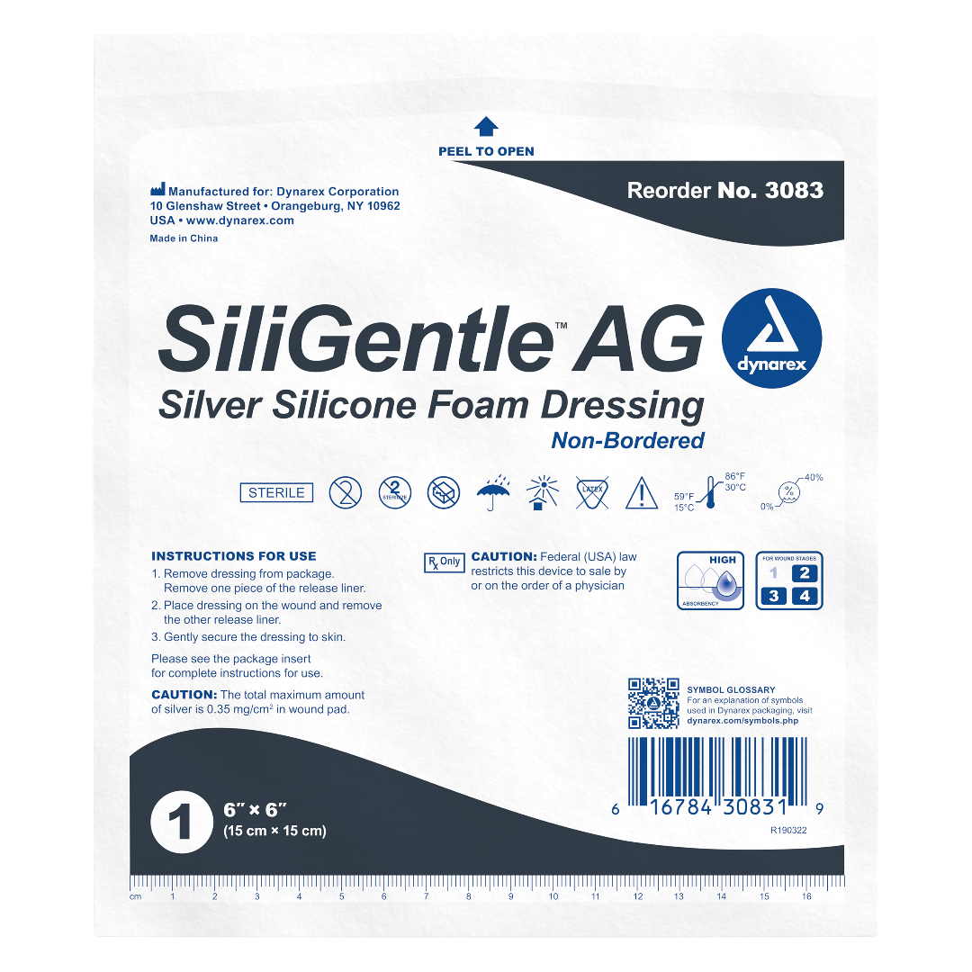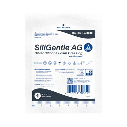 SiliGentleAG is available with or without a border, in a variety of convenient sizes. The gentle silicone adhesive border provides secure adhesion with a low potential for skin irritation.