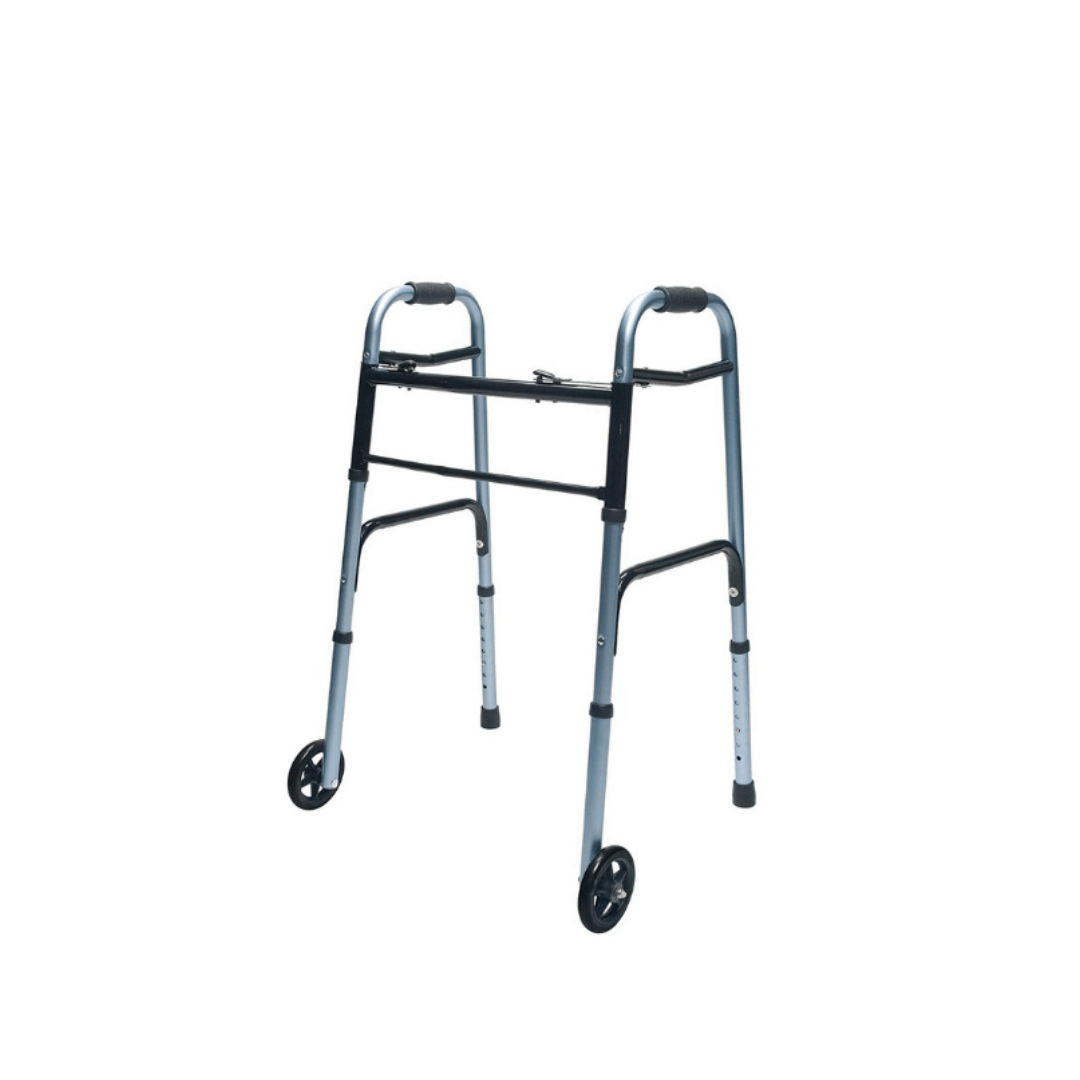 - Dual-release folding mechanism enables user to fold walker sides independently