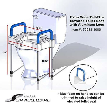 Maddak Tall-Ette Elevated Toilet Seat with Extra Wide Seating Surface and Legs is compatible with most standard and elongated toilets. Height of the toilet bowl should be 17-inches or under in order for the legs of the seat to touch the ground. Features contoured soft foam arm rests designed to assist the user in sitting down or rising from the seat, measures 18-inches in width handle to handle. Ideal for people who need extra assistance because of significant lower extremity weakness or poor balance. Adds 4-inches to the bowl height and eliminates the need for a commode or added toilet seat frame.