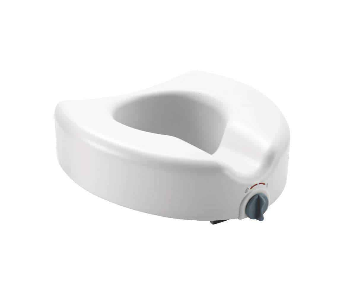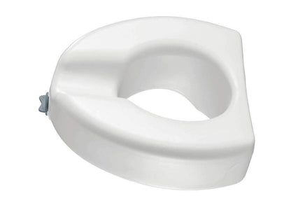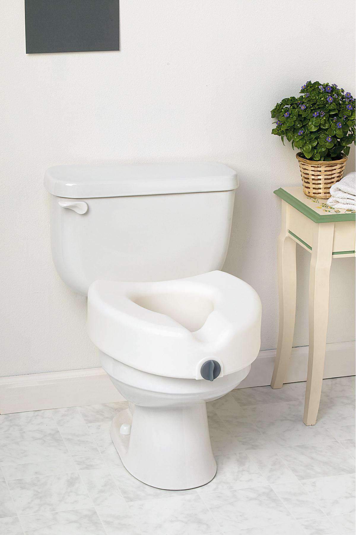 Locking Elevated Toilet Seat: Front clamping mechanism locks the seat onto the toilet so you don't have to worry about it coming loose or shifting during use or transfer. Wide, contoured surface raises seat level by 5-1/2".Provides maximum comfort and fits most toilet bowls from 11"- 14" long.