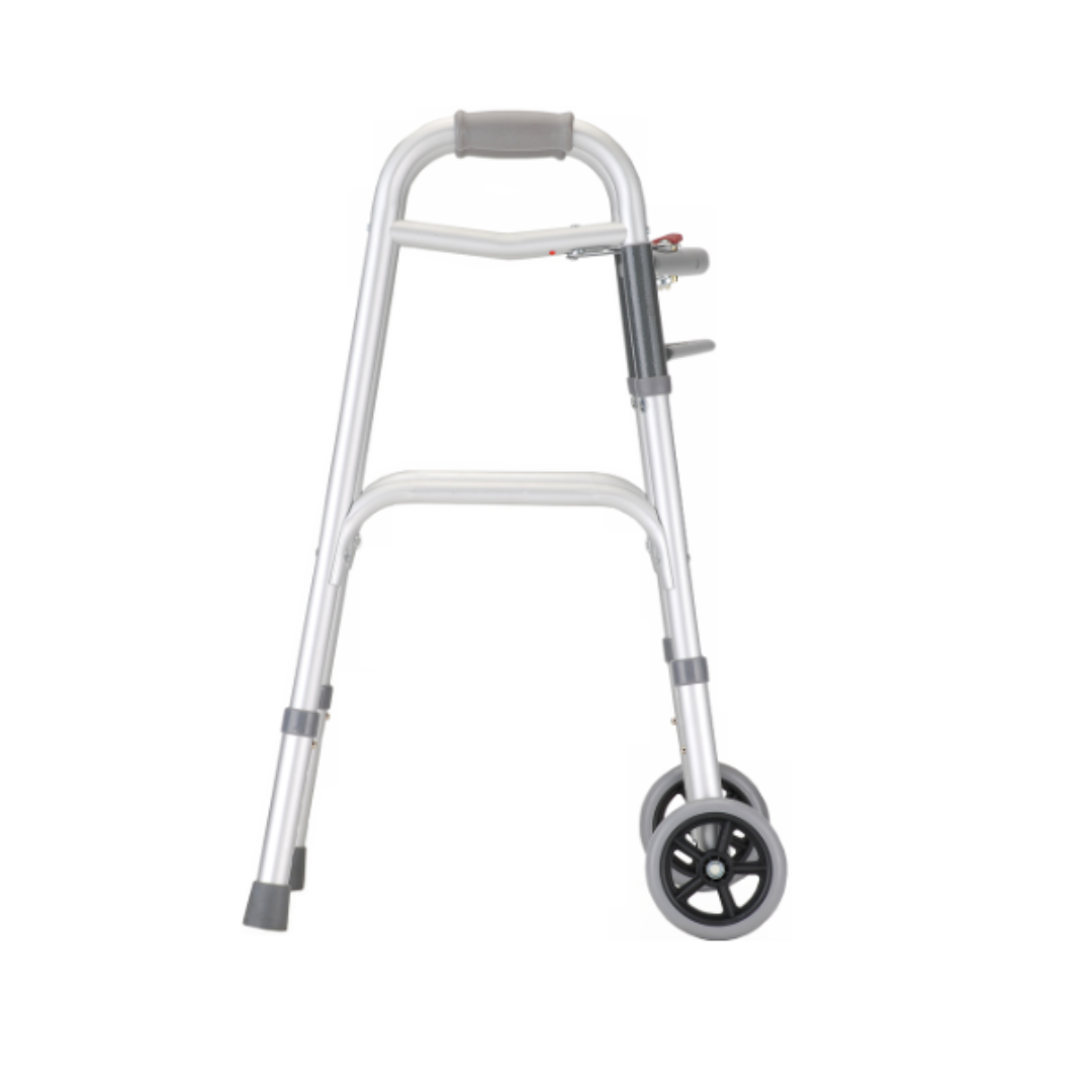 The Nova Medical Petite Folding Walker has a lightweight aluminum frame, 5 inch fixed wheels or no wheels, and a two button release for great security. The walker folds to 4 inch in width for easy transport and storage. The tip size for this walker is 40024. A pproximate User Height: 4ft 7in - 5ft
