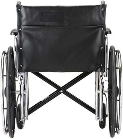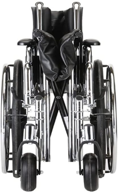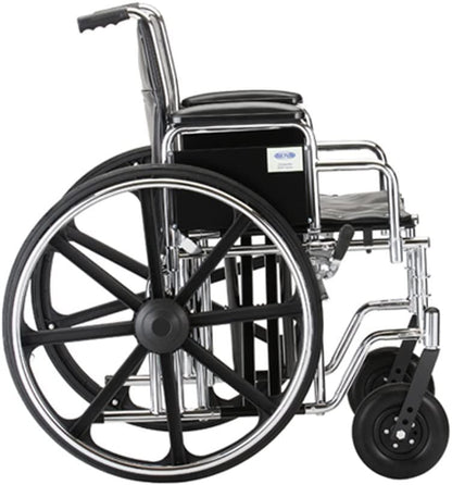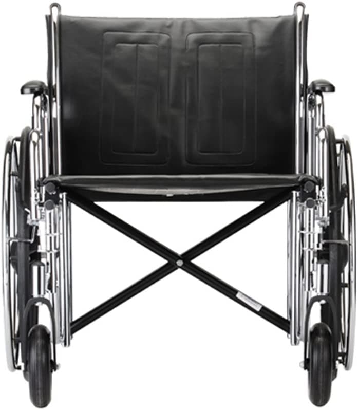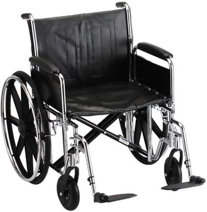 The Nova Medical 5221S Extra Wide 22" Steel Wheelchair comes equipped with detachable and reversible full arms and elevating or swing away leg rests. It also features dual axle positions for quick seat height conversion and flame retardant black vinyl upholstery.