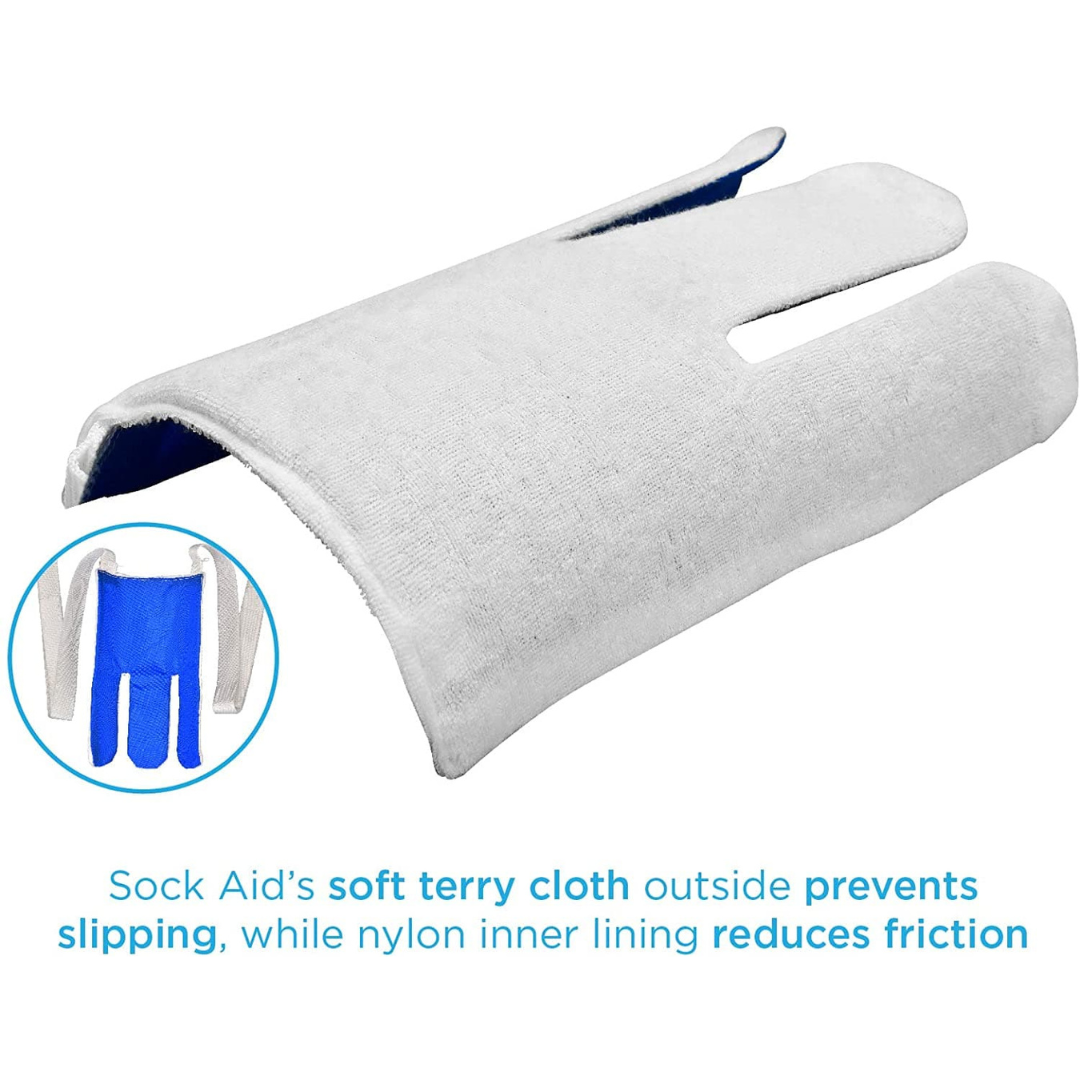 - GET YOUR SOCKS ON WITH EASE & COMFORT with the sock aid that is designed to assist getting your socks or hosiery on. The soft terry cloth outside prevents slipping, while the nylon inner lining reduces friction and gentle on your skin.