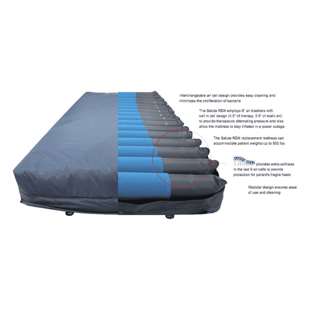- The Salute RDX employs 8” air bladders with cell in cell design (4.5” of therapy, 3.5” of static air), to provide therapeutic alternating pressure and also allow the mattress to stay inflated in a power outage