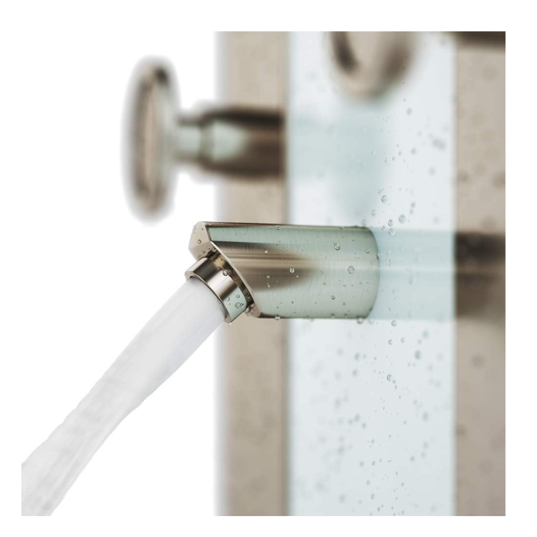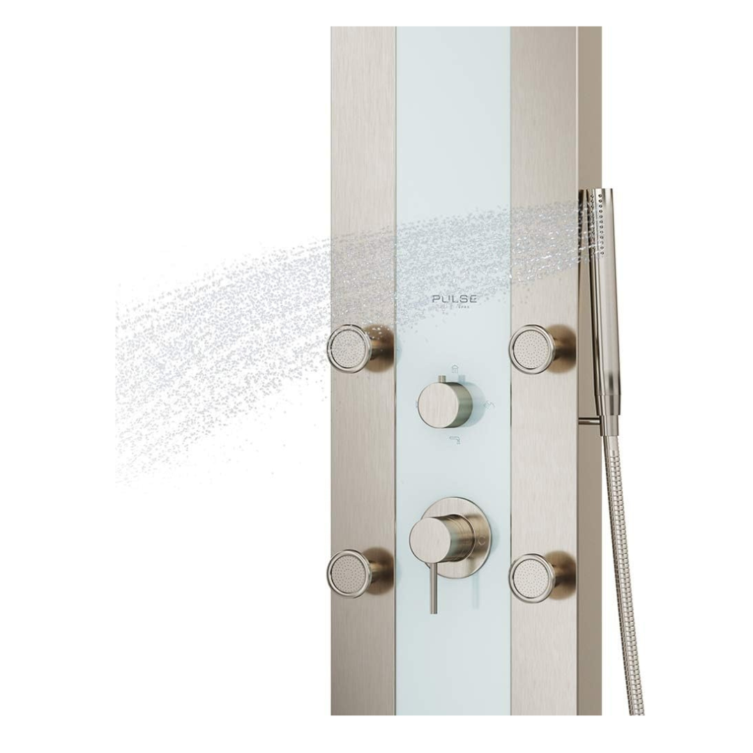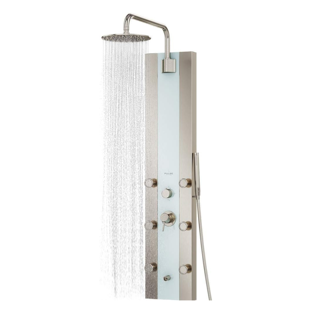 PULSE ShowerSpas 1039W-BN Tropicana ShowerSpa Panel with 10" Rain Showerhead, 6 Body Spray Jets and Hand Shower, White Glass with Brushed Nickel Fixtures, 2.5 GPM . Enjoy the spa treatment at home with the invigorating Tropicana ShowerSpa. Designed to fulfill every showering need, this pre-plumbed shower panel is surface mounted and can be installed in your pre-existing shower. The Tropicana ShowerSpa is beautiful; elegant brushed-nickel fixtures complement the 5/16” soft white tempered glass panel with brushed stainless steel body.