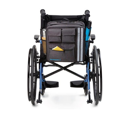 - Hangs on the back of the wheelchair, freeing hands for easy transportation.