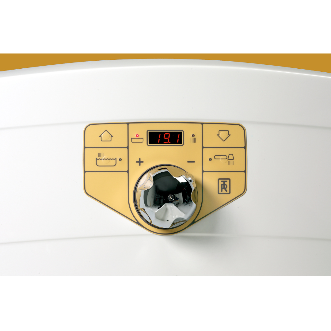 - The 3/4” (22 mm) thermostatic mixing valve, the 3/4” internal piping and the double filling spouts give a good water flow and short filling time.